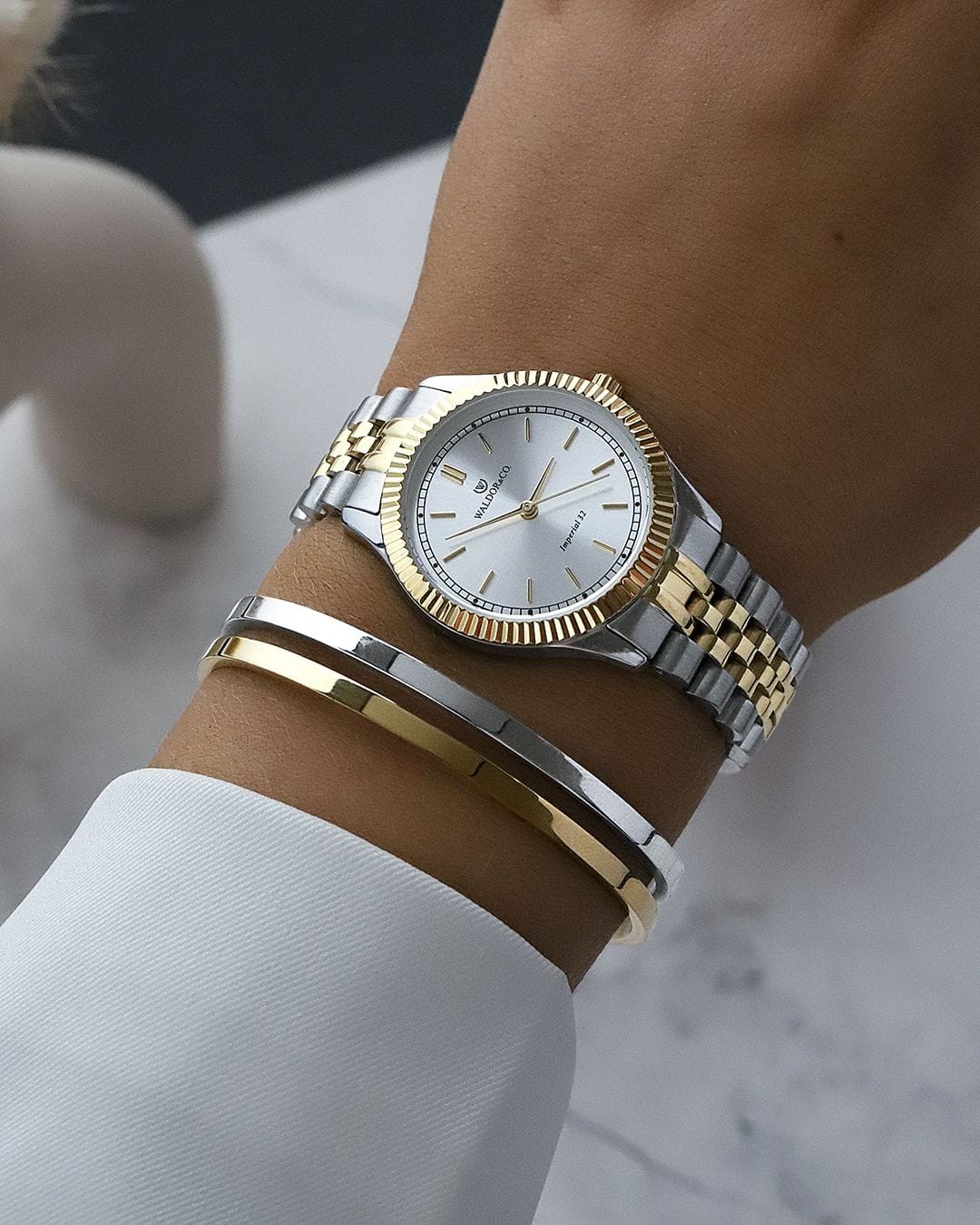 Часы и браслет в одном металле: сталь или чёрный. Этого достаточно, чтобы образ выглядел собранно.