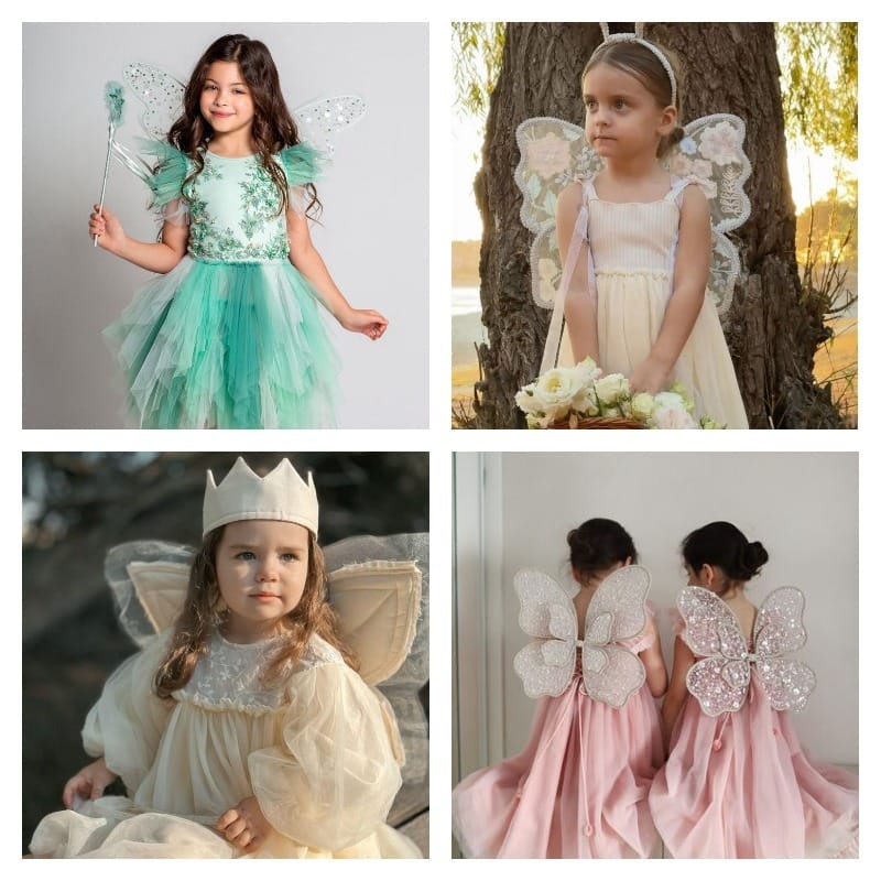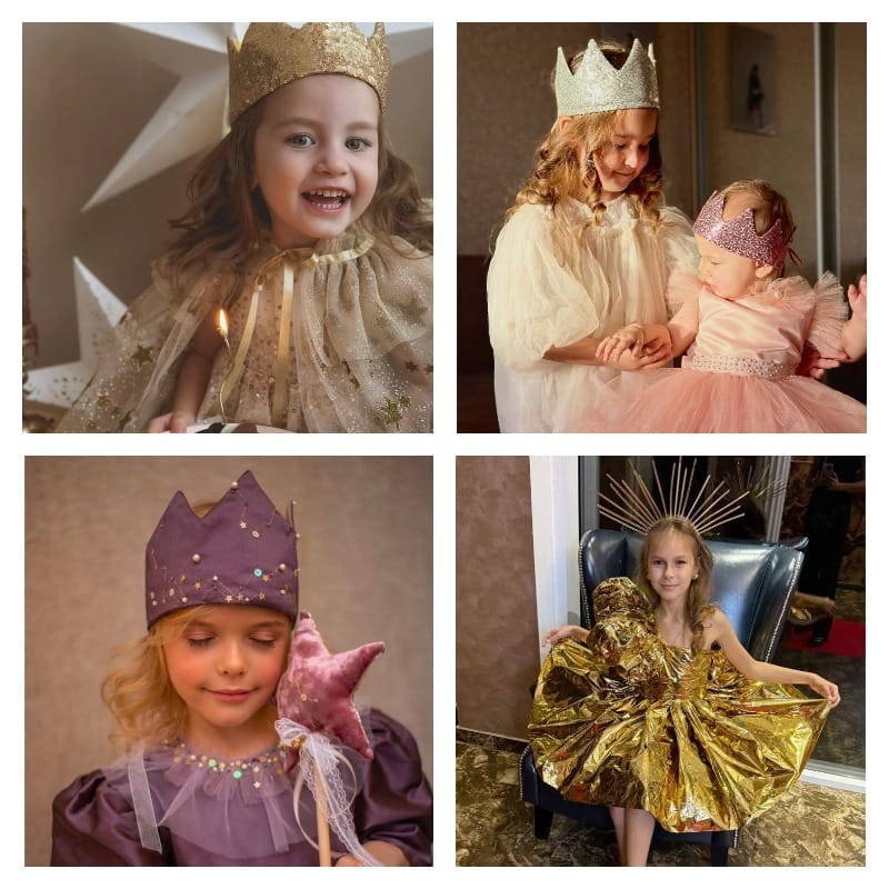 - Для фей и принцесс — фатин, органза, атласные ленты и лёгкие крылышки. Крылья можно сделать из проволоки, обтянутой капроном, или тонкой сетки. Украсьте их блёстками или пайетками для мягкого свечения.