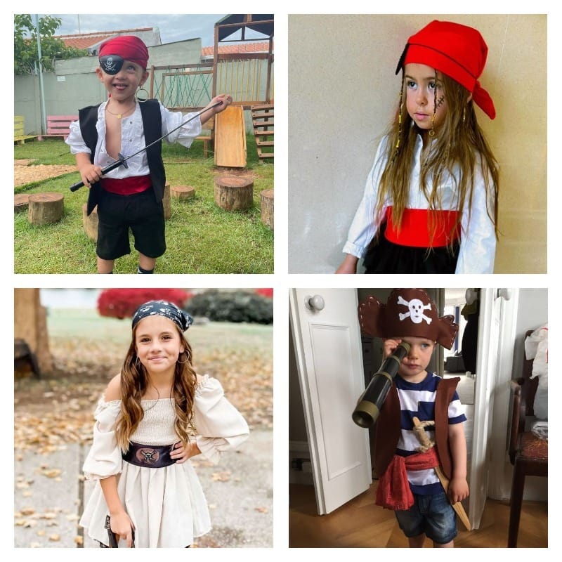 - Для пиратов — нашивки с черепом, золотистые пуговицы, полосатый пояс и крупная серьга-клипса. Добавьте карту сокровищ в карман или маленький мешочек — и костюм станет «живым».